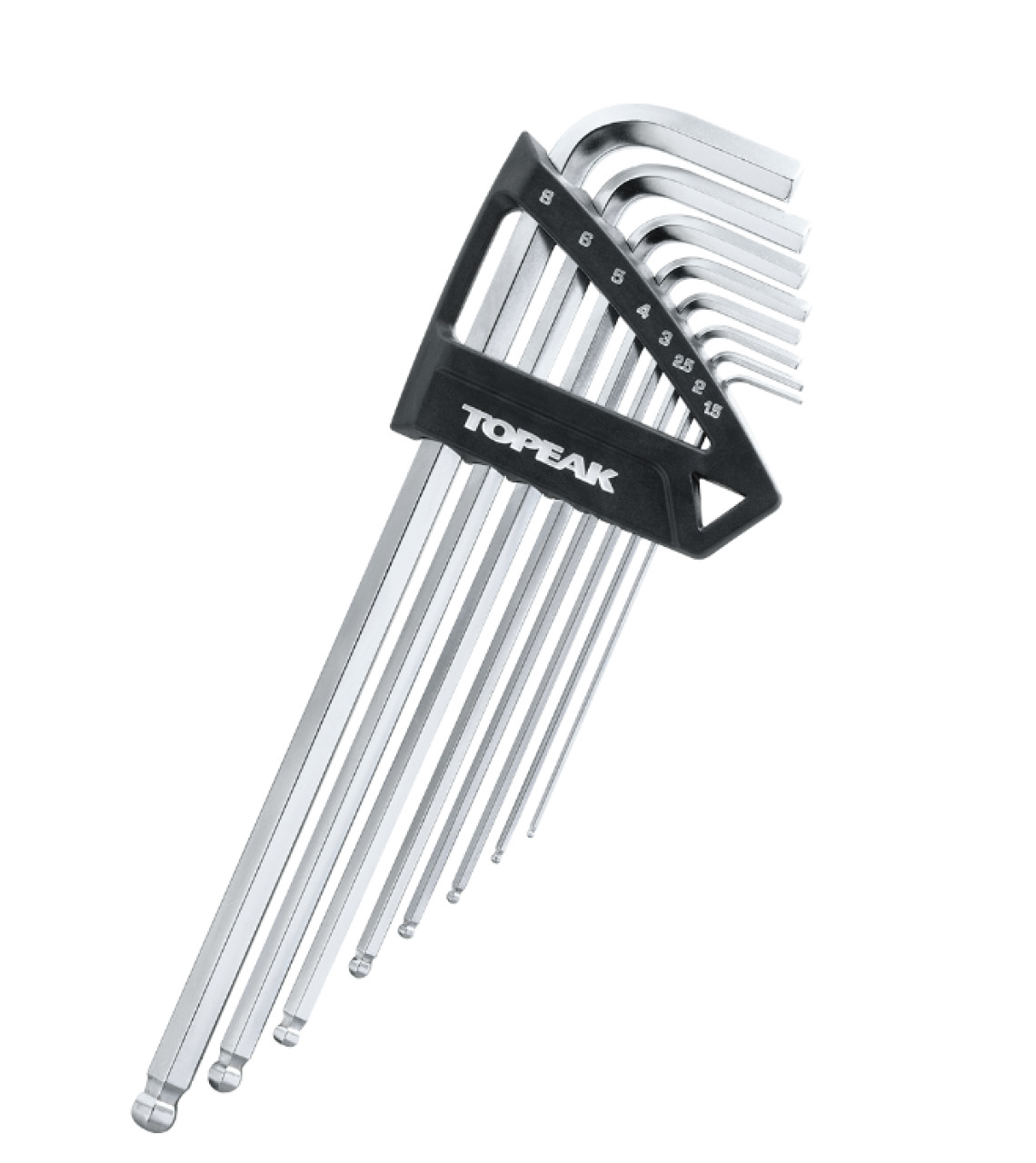 Duohex Wrench Set от именитого производителя качественных компонентов Topeak - комплект удобных и надежных шестигранников для мастерских и частного использования. Инструмент выполнен из надежной инструментальной стали SNCM-V. Наконечник не слизывается и не срывает грани крепежных элементов, отлично подойдет для регулировки и обслуживания узлов и деталей трансмиссии велосипеда. Наконечник имеет шарообразную форму, позволяющею пользоваться инструментом под углом с неудобно расположенным крепежом. Набор включает в себя размеры 1.5, 2, 2.5, 3, 4, 5, 6, 8 мм.
